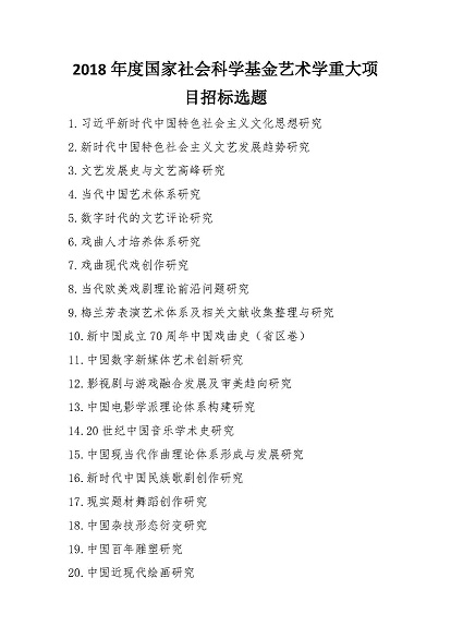 经文化部和全国艺术科学规划领导小组批准,2018年度国家社会科学基金艺术学重大项目面向全国公开招标。现将有关事项公告如下: