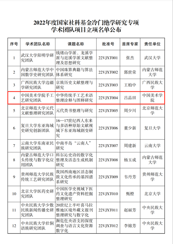 近日,全国哲学社会科学工作办公室公布了2022年度国家社科基金冷门绝学研究专项立项名单。由中国美术学院民艺研究所所长吕品田教授为首席专家的手工艺研究团队,获得“中华传统手工艺术语整理诠释与图释研究”学术团队项目的立项。本年度全国学术团队项目立项共12项,该项目是浙江省唯一获批的学术团队项目。这是我校首次获得国家社科基金冷门绝学研究专项的学术团队项目,实现了在国家社科基金重大项目立项上的新突破。