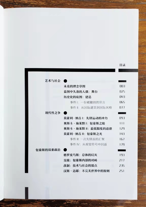 全书主体由三部分构成,特写包豪斯历史上的几个重要时刻及其关键人物:一、“艺术与社会”聚焦包豪斯核心理念的转型时期;二、“现代性之争”聚焦包豪斯内部技术潜能和主体解放的两条相冲突的实现路径;三、“包豪斯的双重政治”聚焦包豪斯两种社会愿景和组织模式的交接过程。贯穿其中的精神引线,则是三组在当前创造领域仍旧持续作用的对抗性构成:私我与大公,进取与回转,抗辩与建构。包豪斯作为同时期先锋派最终的汇聚点,充分感受到时代的共振,它从未平复的各种冲突让现代主义计划的多重矛盾得以充分展现,在这个意义上,它也标示出美学先锋运动的临界点。对此,作者在文末绘制的历史图解长卷提供了一幅综合直观的速写,这份图卷将变动中的社会情境和复杂力场构建为底图,择要勾勒出“包豪斯十四年”的基本轮廓,既呈现内部诸多事件的张力变化,也呈现包豪斯人与其他艺术先锋派的变动关系,以及这些变化对整个时代诸多重大事件的回应。